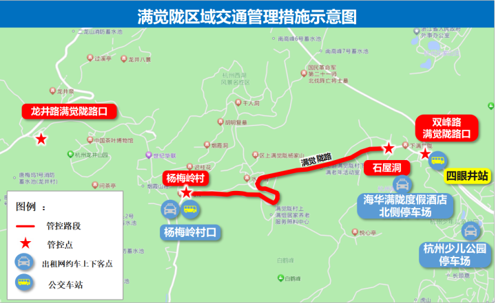 满觉陇区域,国庆中秋假期每天8时30分至20时30分,对出租车和网约车实施在杨梅岭村口、海华满陇度假酒店北侧停车场和少儿公园停车场定点上下客管理,并视情采取满觉陇路(石屋洞至杨梅岭村路段)禁止机动车通行的临时交通管理措施。