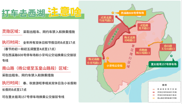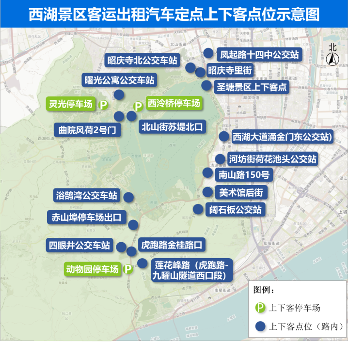 南山路、北山街、虎跑路、灵隐路、灵溪南路、杨公堤等道路出租车和网约车不可随意停车。上下车请认准以下点位!