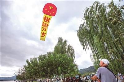 昨天下午,一位市民在西湖边放飞写有“祖国万岁”字样的风筝。 记者 陈中秋 摄