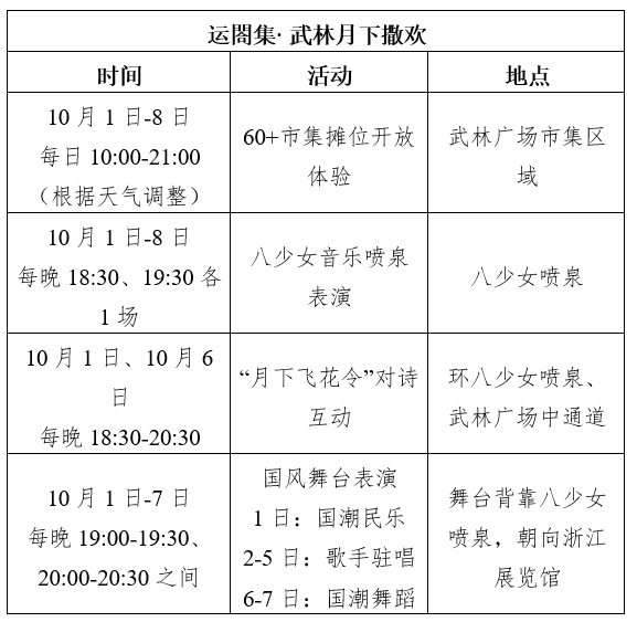 除了逛和吃,还能在“运閤集· 武林月下撒欢”里找到礼乐投壶、书法漆扇、文创DIY等别具特色的互动体验,晚上还有月下对诗和热闹演出。