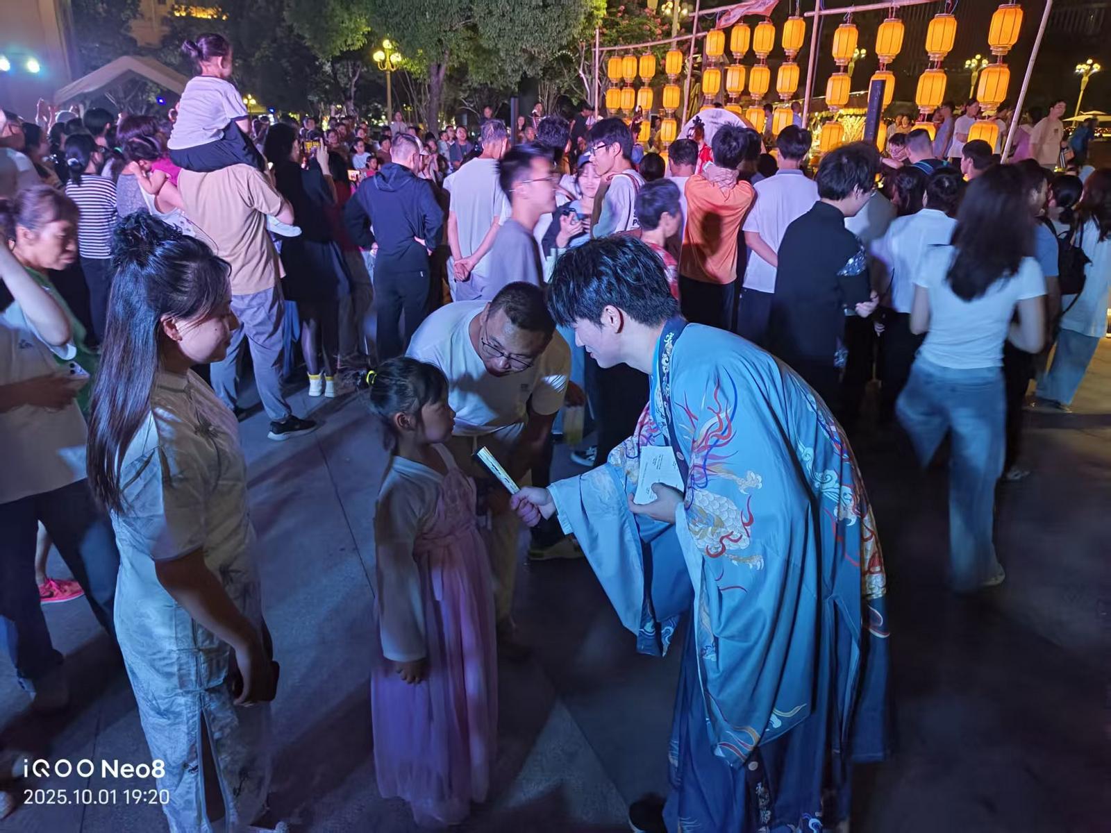 10月1日与6日晚18:30至20:30,3名“诗歌少年”将在广场中通道和八少女喷泉附近与路人“对诗答题”。在10月1日至7日,每晚音乐喷泉时间前后,现场的国风小舞台还将推出国潮新民乐、歌手驻唱、国潮舞蹈等现场表演活动。