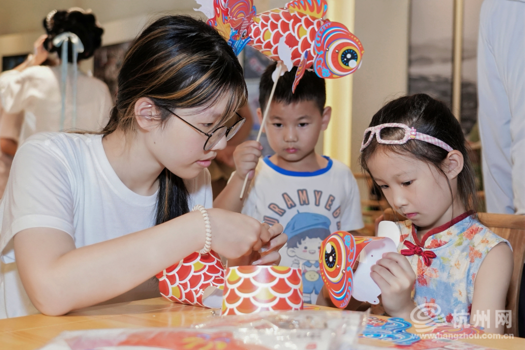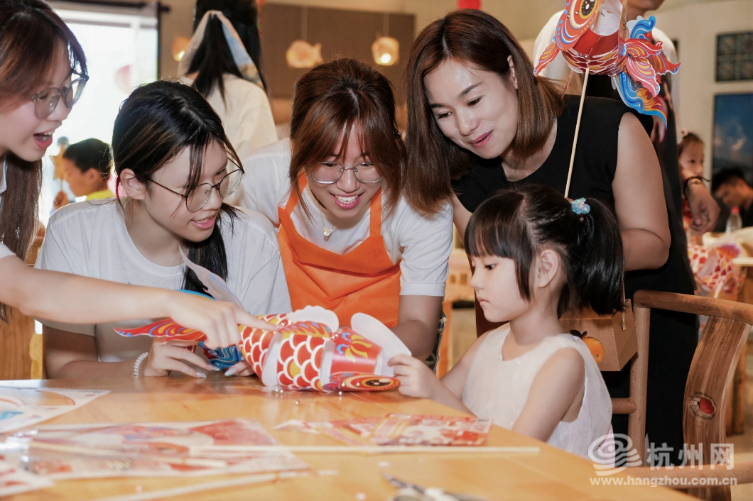 来自中国美术学院、宁波大学、浙江农林大学等高校的30余名大学生,现场展示了为乡村量身打造的文创成果,并带领游客、村民沉浸式体验渔灯制作、扎染、漆扇绘制、茶皂手作等非遗项目,在指尖互动中传递乡土文化,绘就了一幅“校地共乐、文旅融合”的国庆乡村图景。