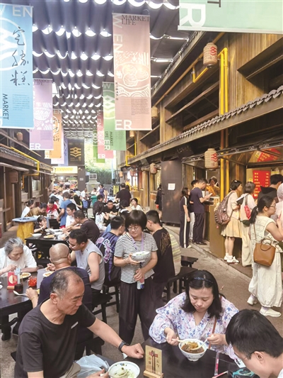 夜幕降临,清河坊历史街区的人越来越多。沿街的饭店里几乎都坐满了人,小吃店门口也排起了长队。