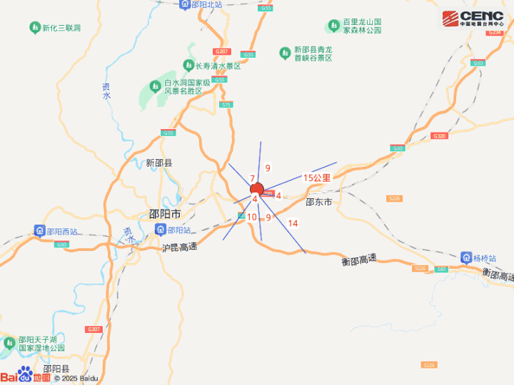 周边县城:震中距邵东市11公里、距双清区15公里、距北塔区19公里、距新邵县19公里、距大祥区21公里,距邵阳市18公里,距长沙市162公里。