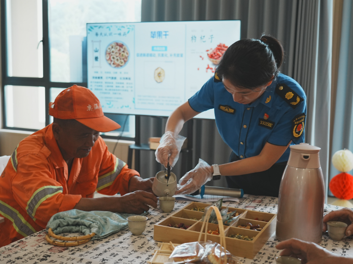 在余杭区余杭街道,一场以“情满中秋·茶润品月暖橙衣”为主题的中秋养生茶会温馨上演。活动现场,城管工作人员向环卫工人讲解中秋节的历史渊源与传统习俗并开展知识抢答活动,环卫工人在互动中赢取精美的国风手袋礼品,现场掌声与欢笑声不断。工作人员还为环卫工人送上桂花乌龙、菊花枸杞茶、健康的低糖月饼,让平日忙碌的环卫工人得以暂歇脚步,享受片刻惬意。