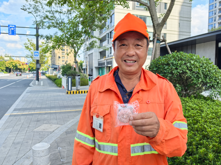 来自安徽的贾秋兰大姐和丈夫孟祥超在余杭做保洁员已近五年,她笑着将中秋礼物拍照发给了孩子们:“我们在杭州过节很好,热闹着呢!”对她而言,节日坚守岗位虽是常态,但暖心的关怀让杭州也有了家的温度。