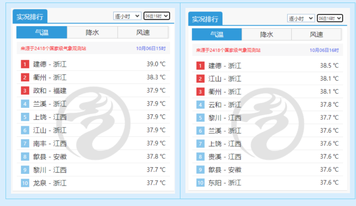气象数据显示,今天我省有6个国家气象站超过了38℃线,其中杭州建德更是以39.0℃的傲人成绩,热到了全省第一,并同时热到了全国第一(两个时次均位列全国气温榜榜首)。