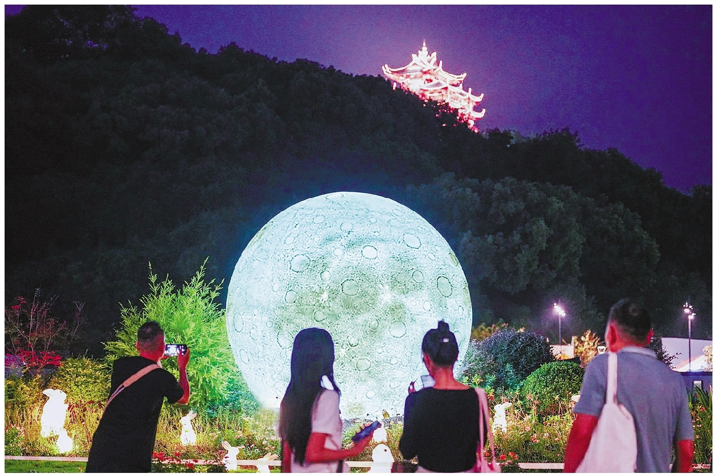 中秋佳节,一轮直径3米的“超级月亮”在吴山广场的花海里“升起”,与灯火辉煌的城隍阁相呼应。记者 李忠 摄