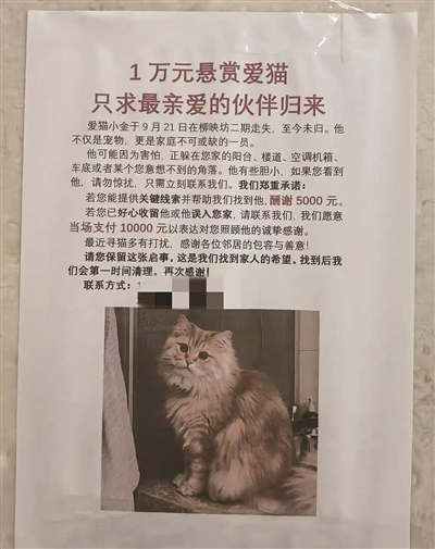 徐先生说,通常猫不太可能走得太远,会不会被人抱走?寻猫启事贴出后,这两天也有人提供过线索,但找了一圈发现并不是小金。“小金以前偶尔也出去过,但仅限于在家里阳台上转一圈,然后就回来了。”