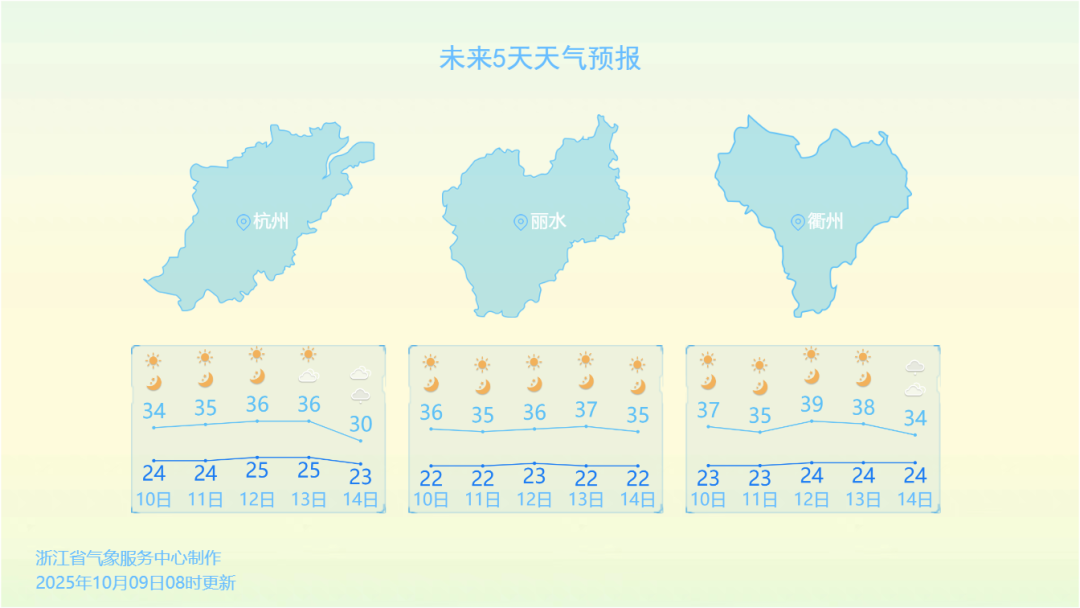 10-13日,浙江省高温强度和范围再次扩大,愈演愈烈,预计全省大部地区最高气温在35-37℃,浙西南地区局部可达38-39℃。