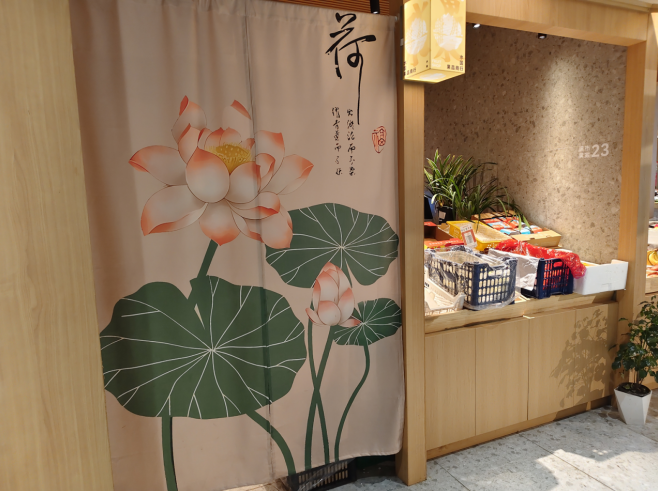 走进市场,悬挂于各摊位入口的荷花图案帘子格外引人注目。淡粉色的花瓣衬着翠绿的荷叶,既雅致又清新。这些帘子不仅巧妙遮挡了摊位内的储藏物品,也为原本略显单调的市场环境注入了生机与活力。“以前摊位里面东西多,看起来有点乱,现在挂上荷花帘子,整个摊位都清爽多了,顾客来了也说心情好。”蔬菜摊位的王大姐笑着说道。