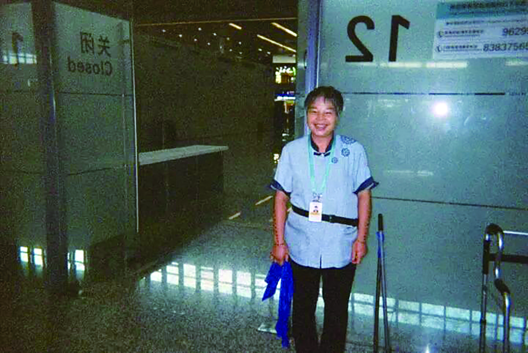 阿姨姓洪,是机场T4航站楼保洁员,主要负责安检口和登机口的环境卫生。那天洪阿姨正在安检口旁拖地,不经意间听到刘女士和工作人员对话,“走人工通道过安检,需要证明相机可用,但安检的地方又不能随意拍照,我就过去跟她说,干脆拍我好了”。