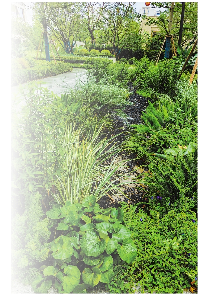 走进项目现场,透水铺装的道路干爽洁净,宅间绿地别有洞天:下凹绿地上错落有致地种植着熊猫堇、迷迭香、柳叶星河等观赏性植物,白色鹅卵石铺就的旱溪在绿地间蜿蜒。“有别于常规项目简单的绿地草坪形式,我们把宅间小块绿地打造成雨水花园,将溢流井盖等海绵设施巧妙‘藏’于植物间,在道路边界做了缓坡设计,精选耐淹耐旱植物搭配种植。”项目负责人介绍。