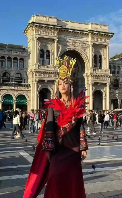 近日,畲族文化传播大使、演员蓝盈莹身着融合10项畲族非遗技艺的“凤舞九天·涅槃新生”作品,走上米兰时装周的街头,瞬间吸引了海外时尚界人士及游客的目光。