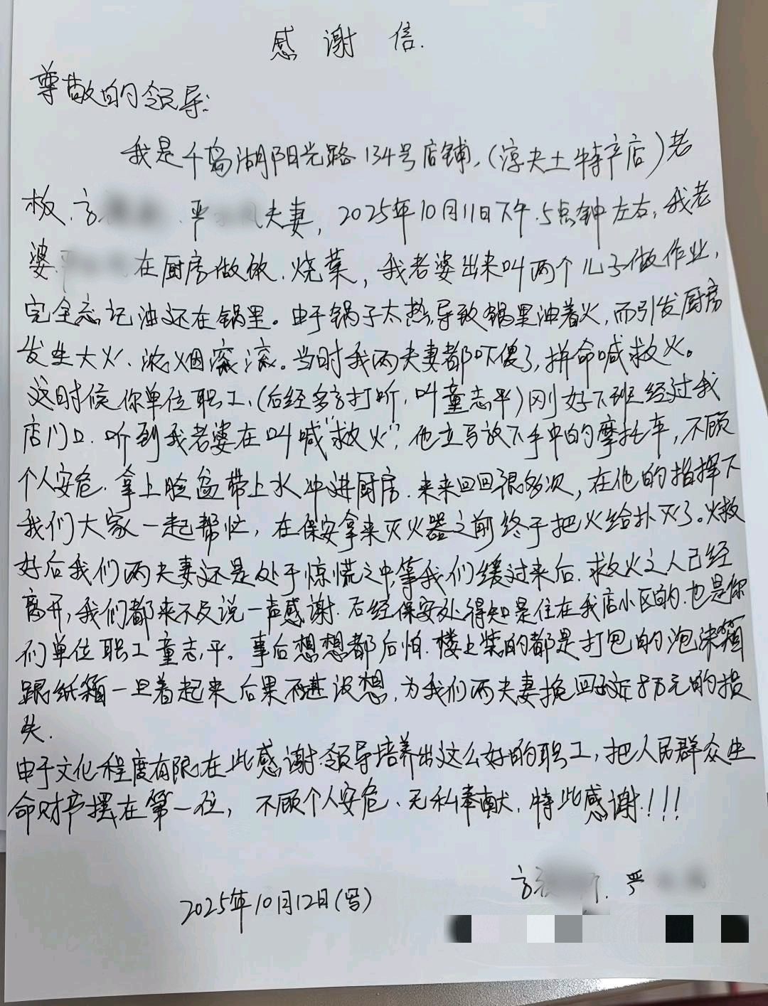 “虽然我们素不相识,但他为我们夫妻挽回了店铺内近8万元的财产损失。”店主在感谢信中动情写道:“在此携家眷由衷地感谢贵单位培养出这么好的职工,他把人民群众生命财产摆在第一位,不顾个人安危,无私奉献,特此感谢!”