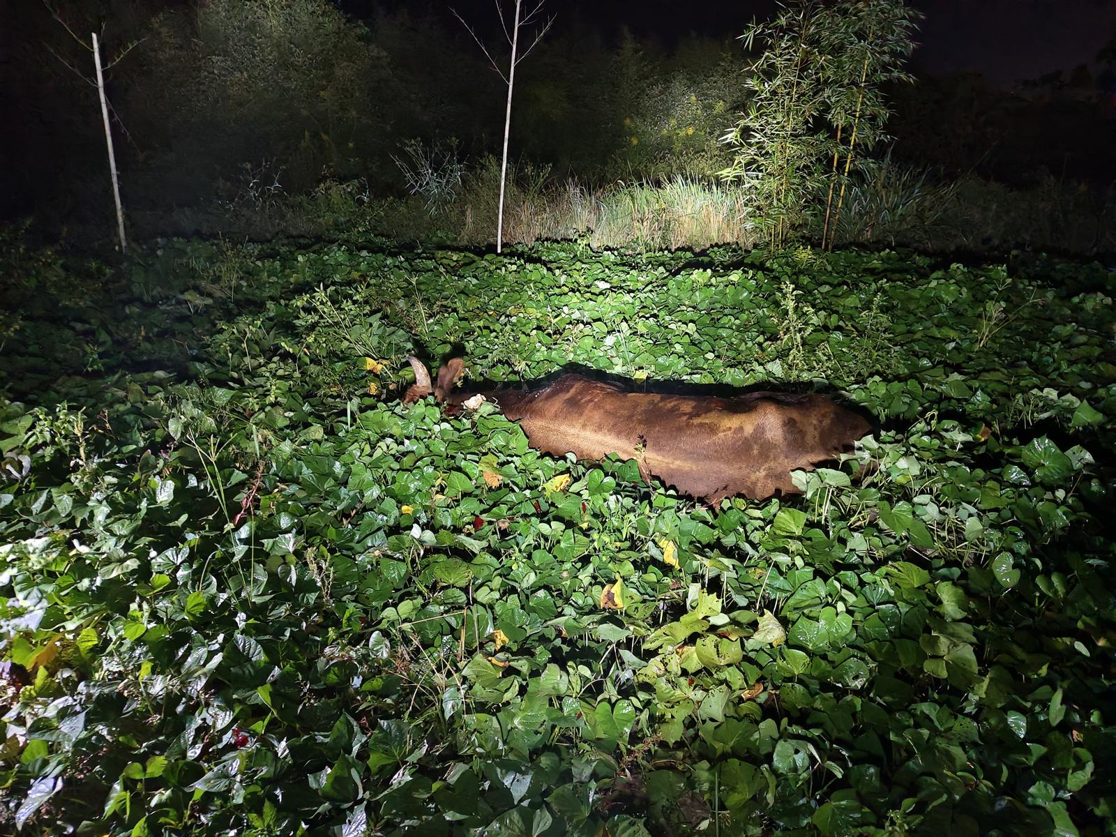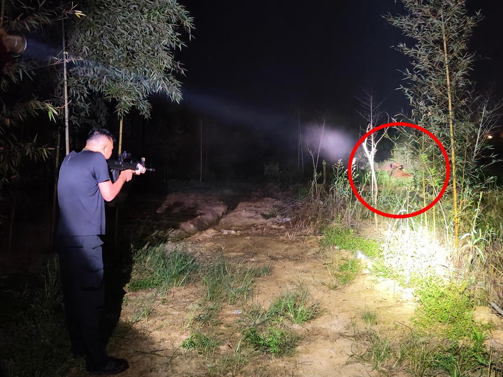 特警处突小组打着手电,在齐腰深的杂草中艰难搜寻。脚步声、虫鸣声与紧张呼吸声交织,每一处草丛的动静都牵动着众人的心。时间一分一秒地过去,一束光照向竹林旁的番薯地——终于锁定那个庞大而躁动的身影。