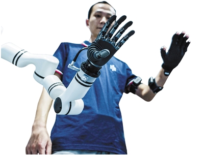 “只要戴上肢体动作识别设备,就可以让机械臂完全模仿我的动作,这个过程中,就把数据采集好了。”工作人员指了指电脑屏幕上跳动的数据,这套设备可用于机器人的控制以及动作训练、数据采集等。