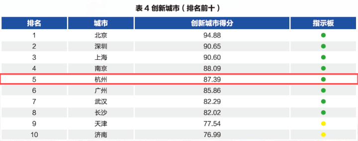 在创新城市方面,杭州排名第5,特别是在技术创新方面,杭州表现突出,培育出数字经济核心产业,形成更多发明专利。