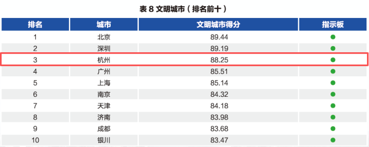 而在文明城市方面,杭州排名第3,报告提到,在社区生活圈建设方面,杭州做得不错,形成了兼具实用性和可复制性的公共服务模式。