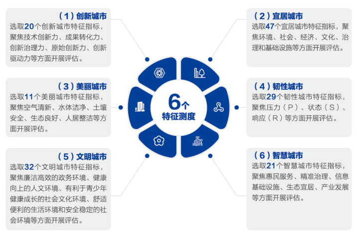 那是如何进行量化评估的呢?主要有6个指标——创新、宜居、美丽、韧性、文明、智慧,这也是中央城市工作会议上提到的六大城市建设目标。