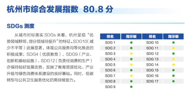 报告指出,从城市对标落实联合国2030全球可持续发展目标(SDGs)来看,杭州呈现“优势领域鲜明、部分领域待提升”的特征。SDG10(减少不平等)进展显著,体现公共服务均等化推进的积极成果,SDG4(优质教育)、SDG9(产业、创新和基础设施)、SDG12(负责任消费和生产)也保持较好的发展势头,反映杭州教育资源优化、产业升级和绿色消费建设基础良好。