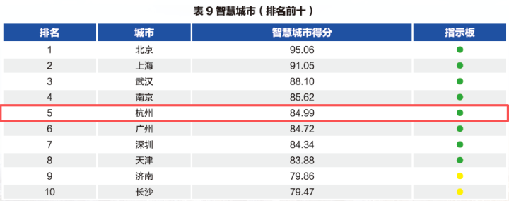 在智慧城市方面,杭州排名第5,在惠民服务、精准治理、信息基础设施建设方面杭州都表现优异。
