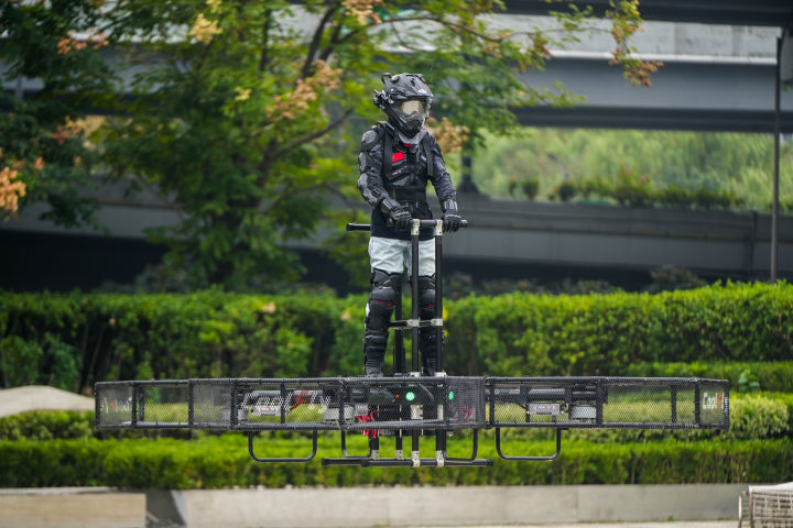 都市快报讯 清晨的杭州,城市主干道上,早高峰的车流已经开始排起长龙。就在这时,几个身影从车流上方掠过——他们脚下的“空中滑板车”在离地约10米的低空稳稳飞行,在城市上空穿梭自如……