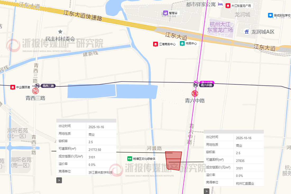 潮新闻讯 近日,江海之城两宗商业用地集中成交,受双地铁TOD辐射及优质城市资源加持,尤为引人注目。QT080406-156地块及QT080406-156-1地块,坐落于规划的钱塘区文化综合体东侧,且受到青六中路双地铁TOD辐射,分别被浙江景林数字科技有限公司和杭州汇盛置业有限公司收入囊中。