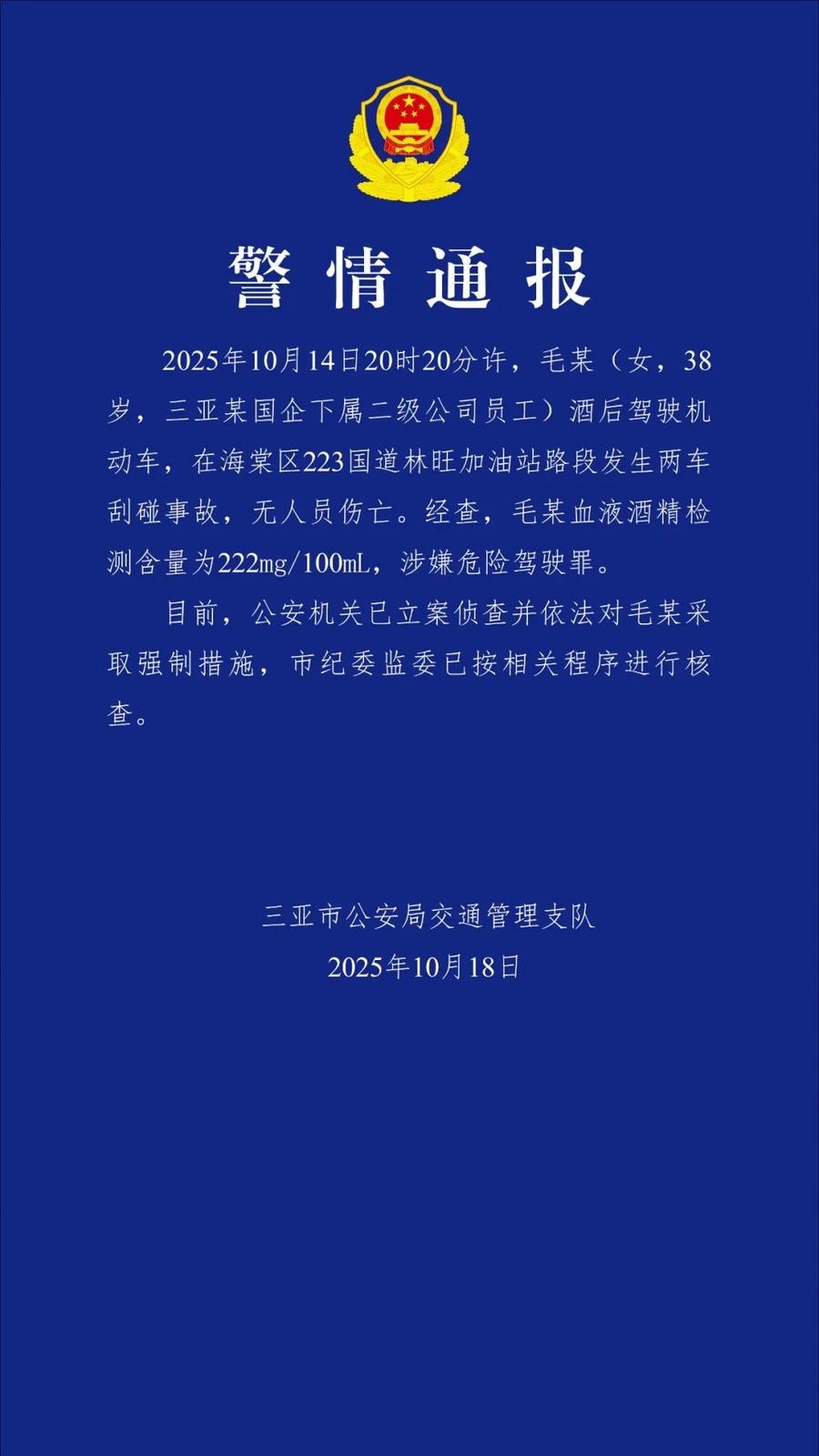 央视网消息:三亚市公安局交通管理支队发布警情通报:2025年10月14日20时20分许,毛某(女,38岁,三亚某国企下属二级公司员工)酒后驾驶机动车,在海棠区223国道林旺加油站路段发生两车刮碰事故,无人员伤亡。经查,毛某血液酒精检测含量为222mg/100ml,涉嫌危险驾驶罪。