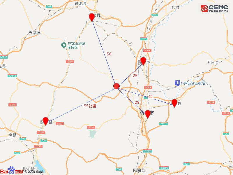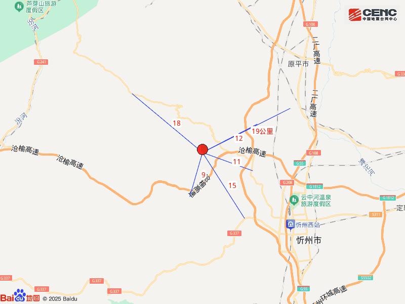 震中距原平市25公里、距忻府区29公里、距定襄县42公里、距宁武县50公里、距静乐县55公里,距忻州市27公里,距太原市86公里。