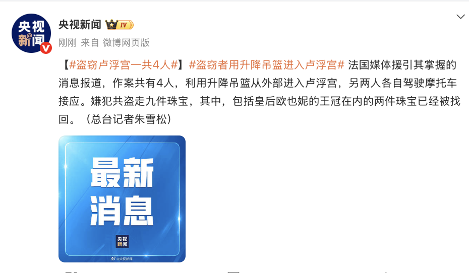 法国媒体援引其掌握的消息报道,作案共有4人,利用升降吊篮从外部进入卢浮宫,另两人各自驾驶摩托车接应。嫌犯共盗走九件珠宝,其中包括皇后欧也妮的王冠在内的2件珠宝已经被找回。