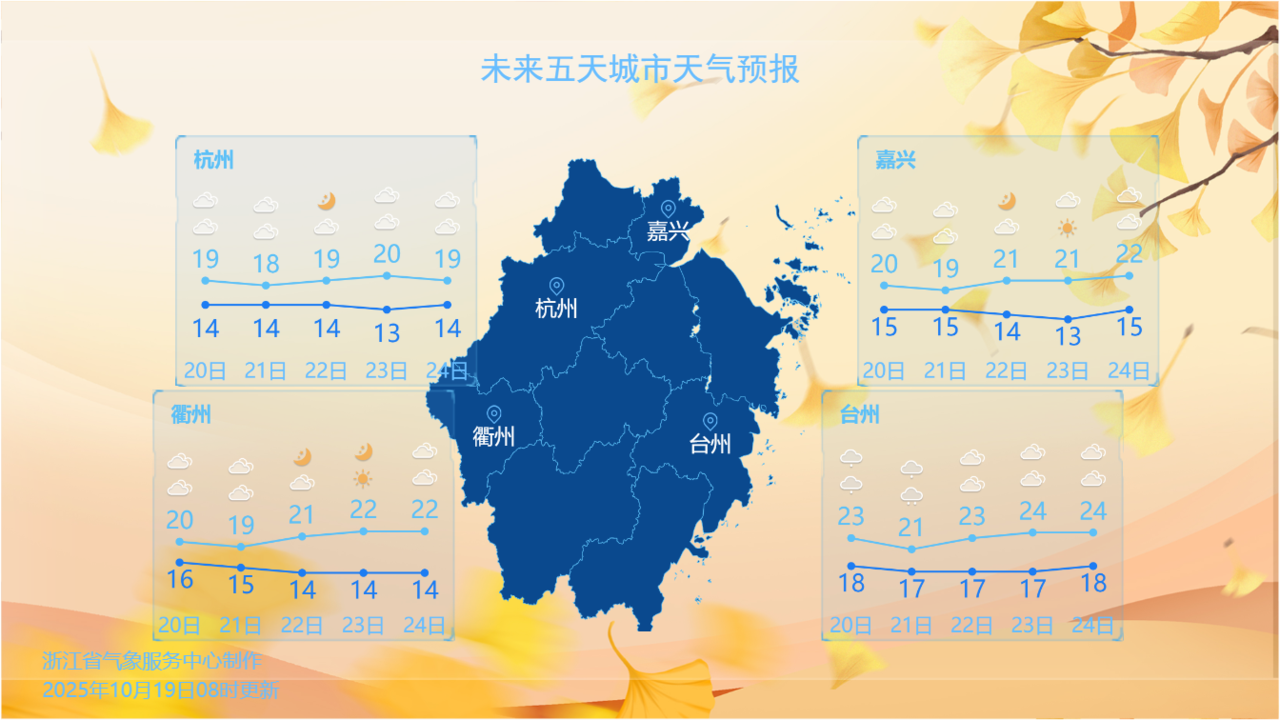 尤其昨天(10月19日),全省大部分地区的最高气温仅有20℃出头。像是杭州,阴冷感持续整天,气温波动幅度只有2.1℃(18.2-20.3℃);而浙南的景宁最高气温较前一天直降10.7℃。