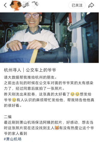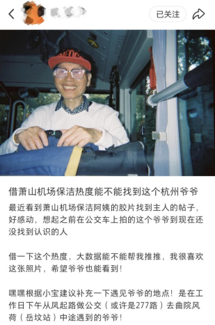 帖子中,沈女士写道,“最近看到萧山机场保洁阿姨的胶片找到主人的帖子,好感动,想起之前在公交车上拍的这个爷爷到现在还没找到认识的人。借一下这个热度,大数据能不能帮我推推,我很喜欢这张照片,希望爷爷也能看到!”