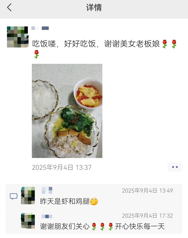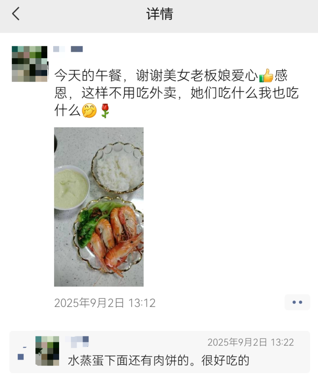“今天的午餐,谢谢美女老板娘的爱心,感恩。这样不用吃外卖,她们吃什么我也吃什么。”