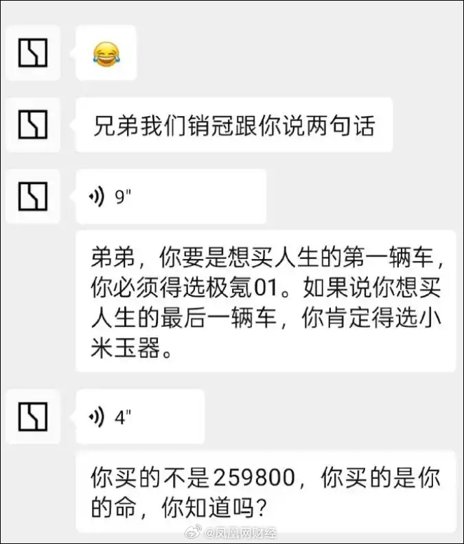 而极氪销售称销冠要跟顾客说两句话,接下来就是两条语音消息:“弟弟,你要是想买人生的第一辆车你必须得选极氪001。如果说你想买人生的最后一辆车,你肯定得选小米YU7。”“你买的不是259800,你买的是你的命,你知道吗?”