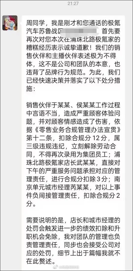 我们的销售伙伴和主播伙伴表述极为不得体,这不是公司和团队的本意,也违背了品牌行为规范。为此,我们已经快速决策并落实了以下处分措施:销售伙伴于某某、侯某某工作过程中言语不当,造成严重顾客体验问题,并对顾客情感造成了伤害,依据《零售业务合规管理办法宣贯》第十二条,扣除合规分12分,属三级违规违纪,立刻解除劳动合同,不得再次录用为集团员工:浦珠北路极氨家店长武某某,直接对下午的严重服务问题承担对应的管理责任,进行合规分扣除3分;南京单元城市经理芮某某,对以上事件负间接管理责任,扣除合规分2分。