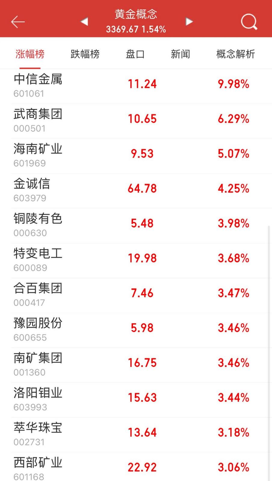 今天A股开盘后,受国际金价强势上涨带动,黄金概念股再次集体上涨。截至午间收盘,黄金概念板块指数涨1.54%,中信金属涨停,多股跟涨。