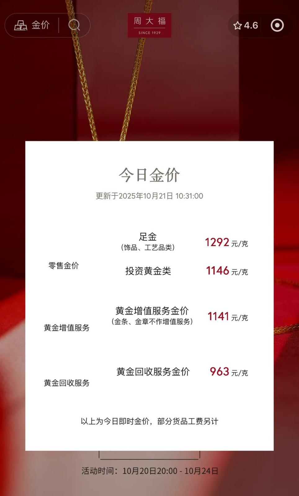 10月21日,老庙黄金足金饰品报价1294元/克,较前一日1258元/克上涨36元/克;周大福足金饰品报价1292元/克,较昨日上涨30元/克;周生生足金饰品标价1289元/克,较前一日上涨27元/克。