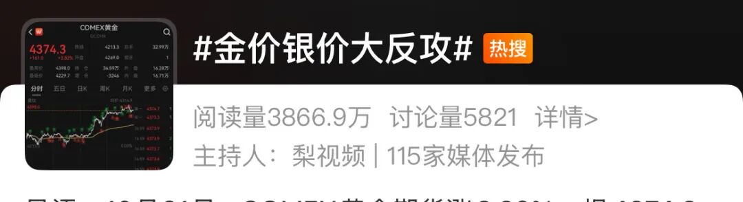 今天上午,#金价银价大反攻#话题冲上微博热搜。网友议论纷纷:“结婚买金都能买贫穷了!”有人担心:“明年结婚,金价会不会持续上涨,发愁……”
