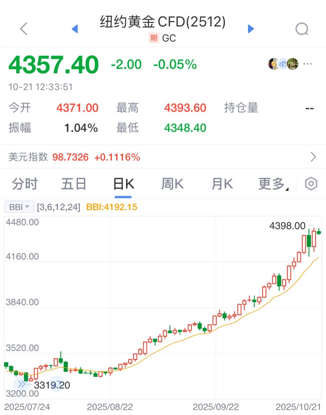 现货黄金突破前高,盘中一度涨超3%,最高报4381.49美元/盎司,截至收盘涨2.46%,报4355.69美元/盎司;纽约商品交易所12月黄金期价收于4359.4美元/盎司,涨幅为3.47%。