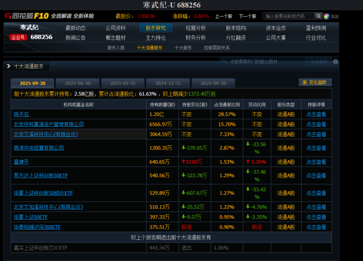 值得一提的是,在寒武纪最新披露的十大股东名单中,杭州牛散章建平不但一股未卖,反而加仓32万股,其持股比例也从二季度末的1.46%升至1.53%,位列公司第五大流通股东,凸显杭州牛散对于国产AI算力板块的看好。