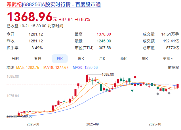 在此之前,“寒王”寒武纪刚刚公布了最新的三季报。2025年前三季度,寒武纪实现营业收入46.07亿元,同比增长2386.38%,实现净利润16.05亿元,上年同期亏损7.245亿元,基本每股收益3.85元/股。