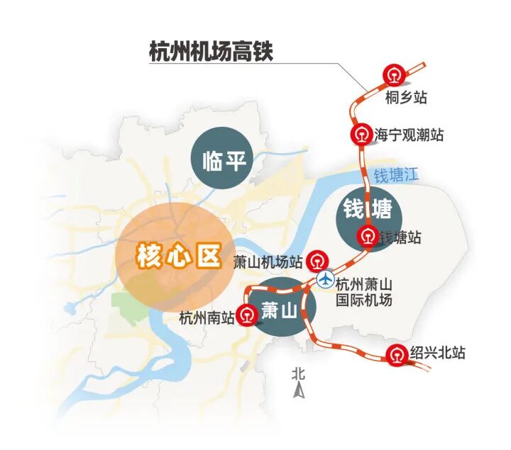全线新设海宁观潮站、钱塘站、萧山机场站,改扩建桐乡站。未来,从萧山机场站出发,高铁可直达杭州市内的钱塘站、杭州南站。