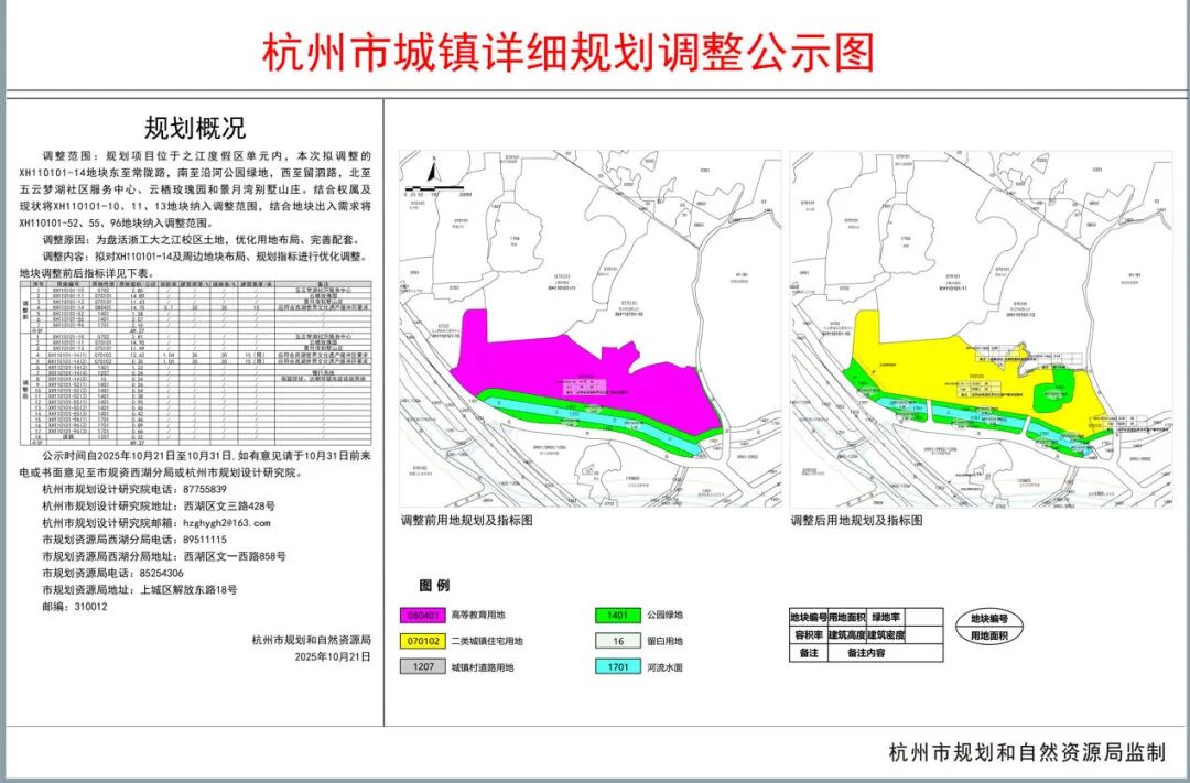公示显示,为盘活浙工大之江校区土地,优化用地布局、完善配套,拟对之江度假区单元XH110101-14地块布局、规划指标进行优化调整。