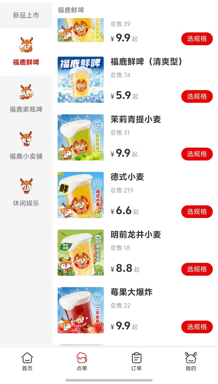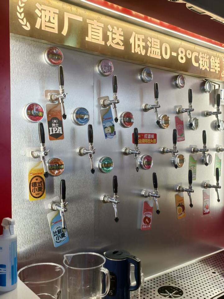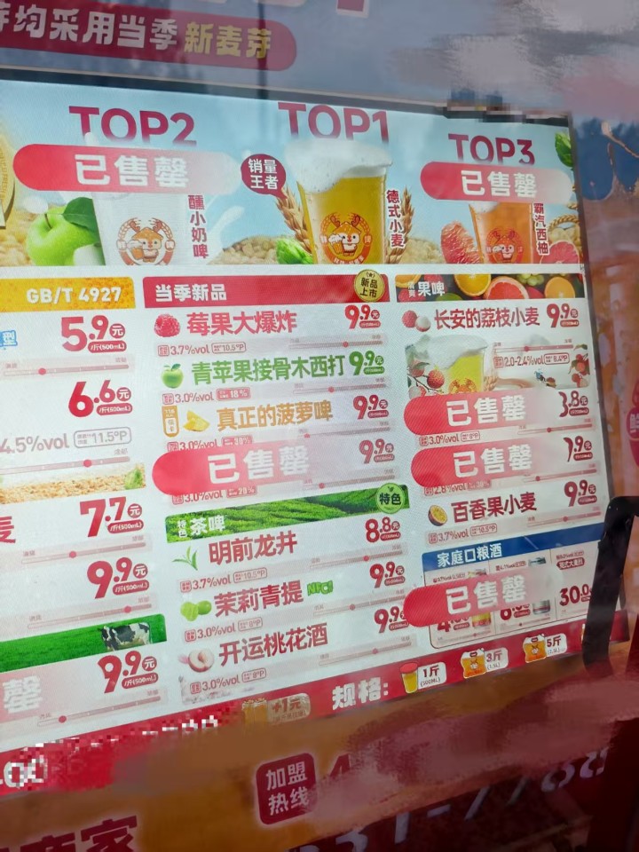 店里主打的是各类精酿啤酒、鲜啤、果啤和茶啤,价格确实很有性价比,福鹿啤福5.9元1斤,爆款的德式小麦1斤装只要6.6元,几款爆款的果啤售价也不超过10元。