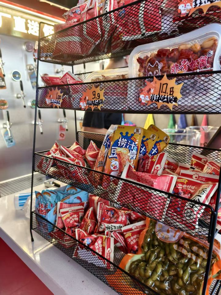 除了啤酒外,店里还有售卖一些蜜雪冰城的零食,多以花生、捞汁豆腐、小鱼干等下酒小食为主,有些门店仅支持外带,也有店铺在门外摆放桌椅,可打包也可堂食。