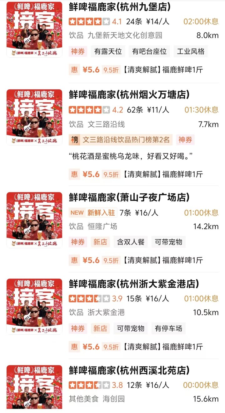 记者在团购平台看到,在杭州也有多家鲜啤福鹿家品牌门店,营业时间多在下午四点后开始,一直开到凌晨一两点。