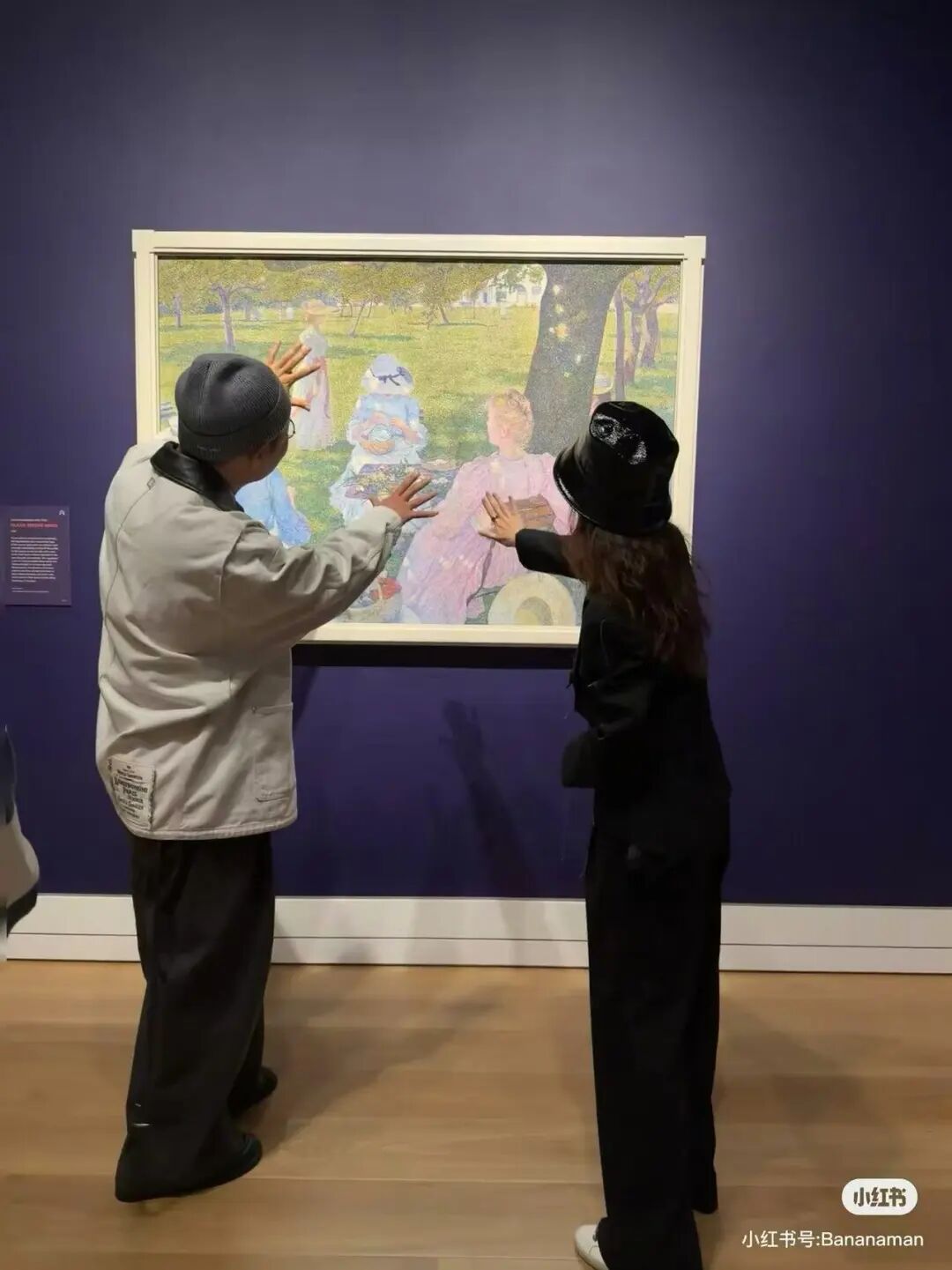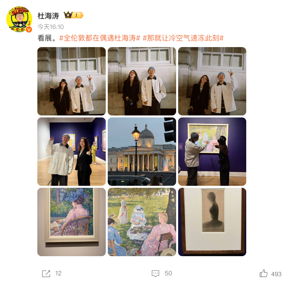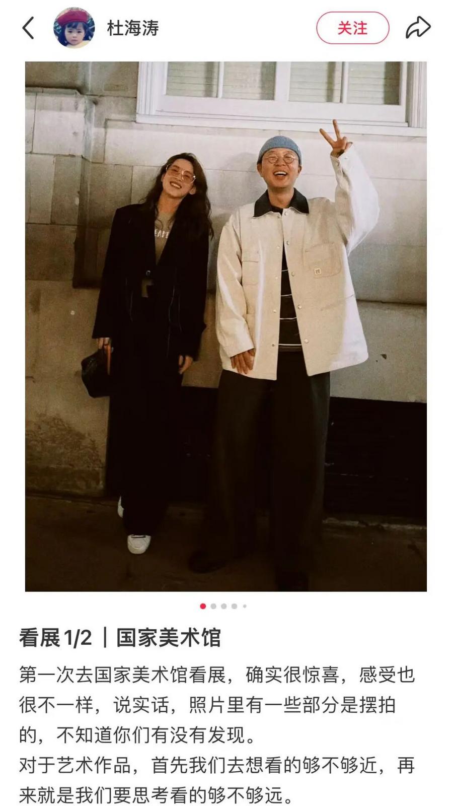10月21日,杜海涛在社交平台发文:第一次去国家美术馆看展,确实很惊喜,感受也很不一样,说实话,照片里有一些部分是摆拍的,不知道你们有没有发现。对于艺术作品,首先我们去想看得够不够近,再来就是我们要思考看得够不够远。So near yet so far。