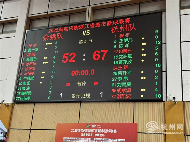 目前,浙BA城市争霸赛小组赛来到了第11轮,也是半程最后一轮。10月22日晚,杭州队在客场以67-52力克余姚队,用一场胜利为半程收官。目前,杭州队以9胜1负的战绩排名小组第二,仅次于全胜的温州队。