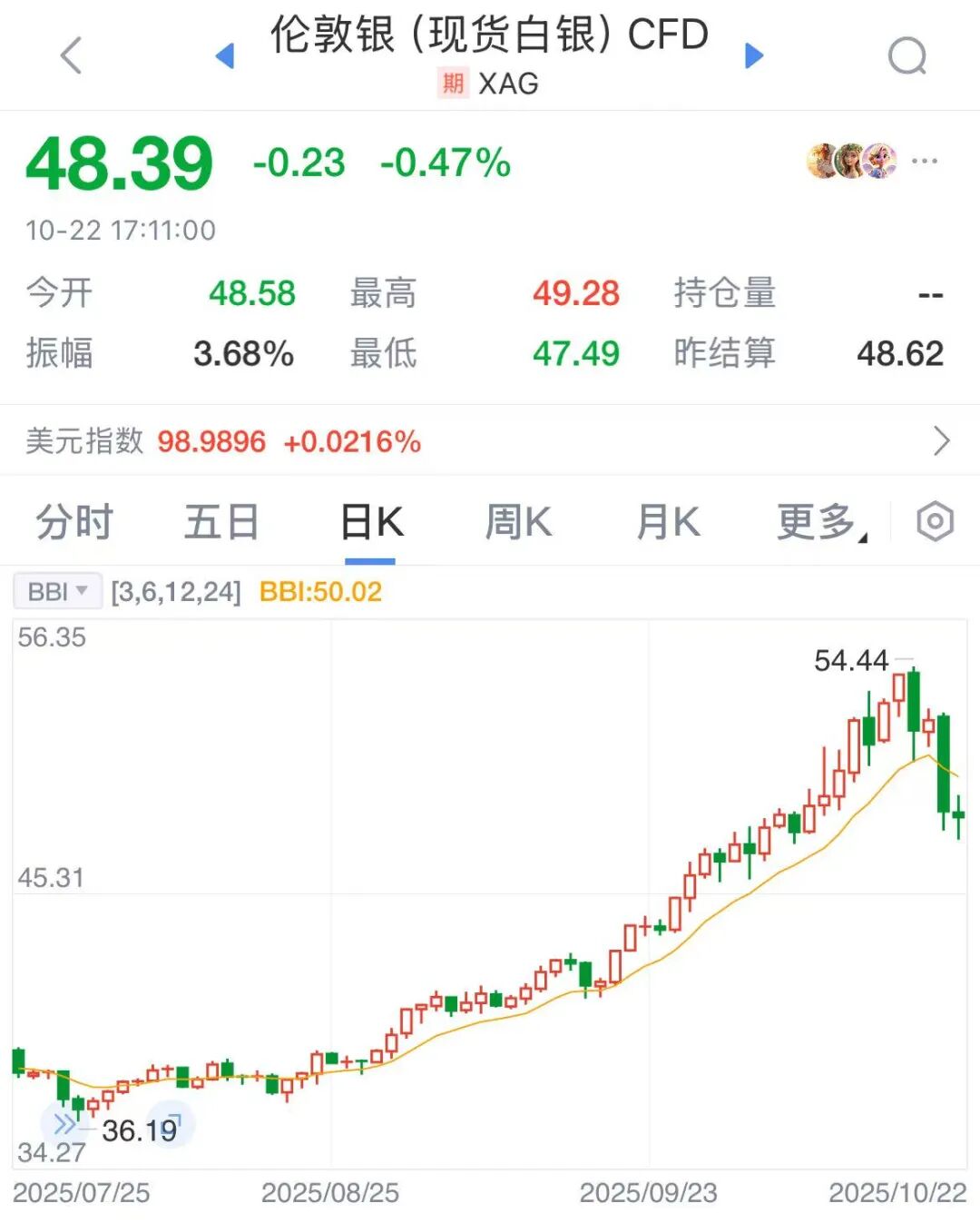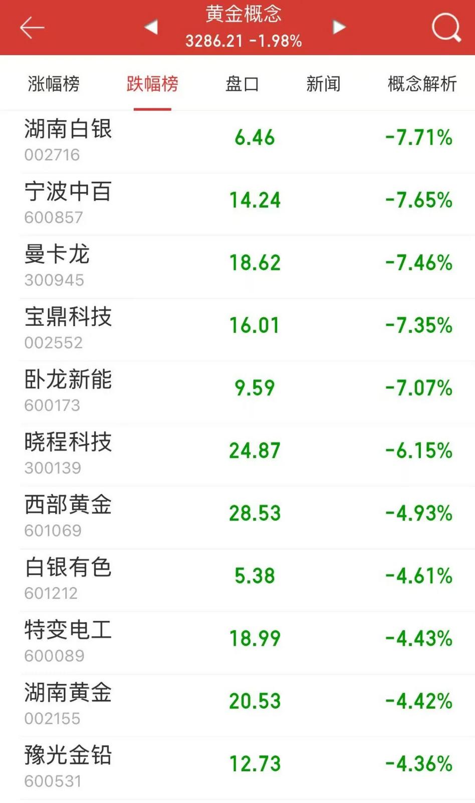 10月22日,截至A股收盘,贵金属板块大跌逾4%,跌幅位列第一。黄金概念板块跌幅也近2%,湖南白银、曼卡龙均跌超7%,西部黄金、湖南黄金等纷纷跟跌。